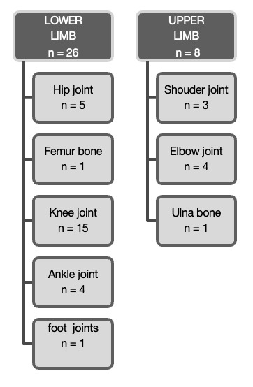 A total of 34 patients met the criteria for inclusion in our study. There were 17 females (50%) and 17 males (50%) in our audit all of whom were of African descent. The average age was 37.97 years (range 2 ‒ 64). The adult group (40 ‒ 60 years) accounted for slightly more cases (44%) followed closely at 41% by the young adult (40 ‒ 60 years) group, the groups are displayed in Table 1. We had one case of a two-year-old with TB osteomyelitis of the ulna. The lower limbs were affected in 76% (n = 26) of cases with the other eight accounted for by upper limb cases (see Figure 4). Moreover, Figure 5., shows that there was a clear predilection for articular involvement with 94% of cases affecting joints with just two cases (6%) localized to a distinct bone in the form of TB osteomyelitis. The two osseous cases in our study presented with osteomyelitis of the ulna and femur bone respectively. The knee joint was the most affected joint in our cohort with 15 out of the 32 joints being affected somehow (see Figure 4). The left knee and right knees were almost equally affected with a left to right knee ratio of 1:1.1.