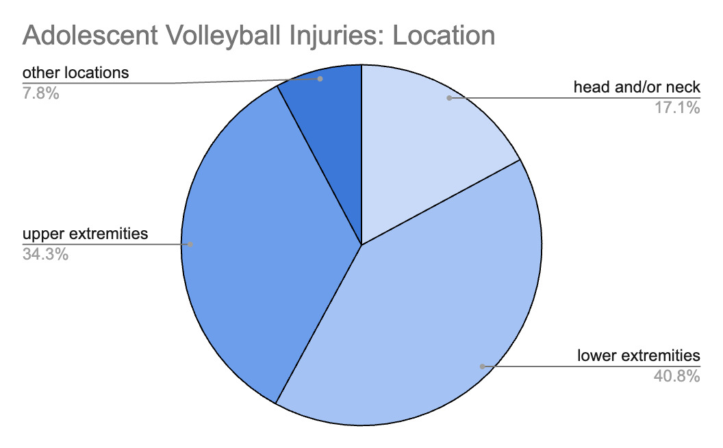 In both sexes lower extremity injuries were the most prevalent, at 40.8 percent, in line with a 2004 study that reported 41 percent of injuries are in the lower extremities, followed closely by upper extremity injuries and head/neck injuries.7 These injury patterns reflect the dynamic and physically demanding nature of volleyball, where rapid movements and sudden changes in direction can predispose athletes to strains, sprains, and fractures.8