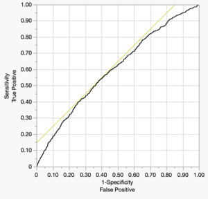 The Receiver operator characteristic is depicted below (Figure 3). The area under the curve is a modest 0.601.