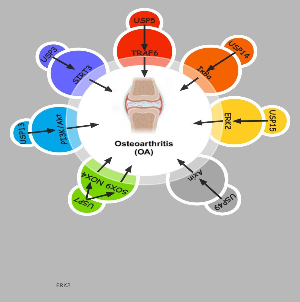 Although the connection between deubiquitinating enzymes and OA is recognized, the current understanding of their specific roles in this disease and how they interact with other molecular pathways to promote its progression remains limited. In addition, the regulation of deubiquitinating enzyme activity holds substantial importance for the identification of novel therapeutic targets, but how to achieve this, especially without affecting other important physiological processes, remains a challenge.