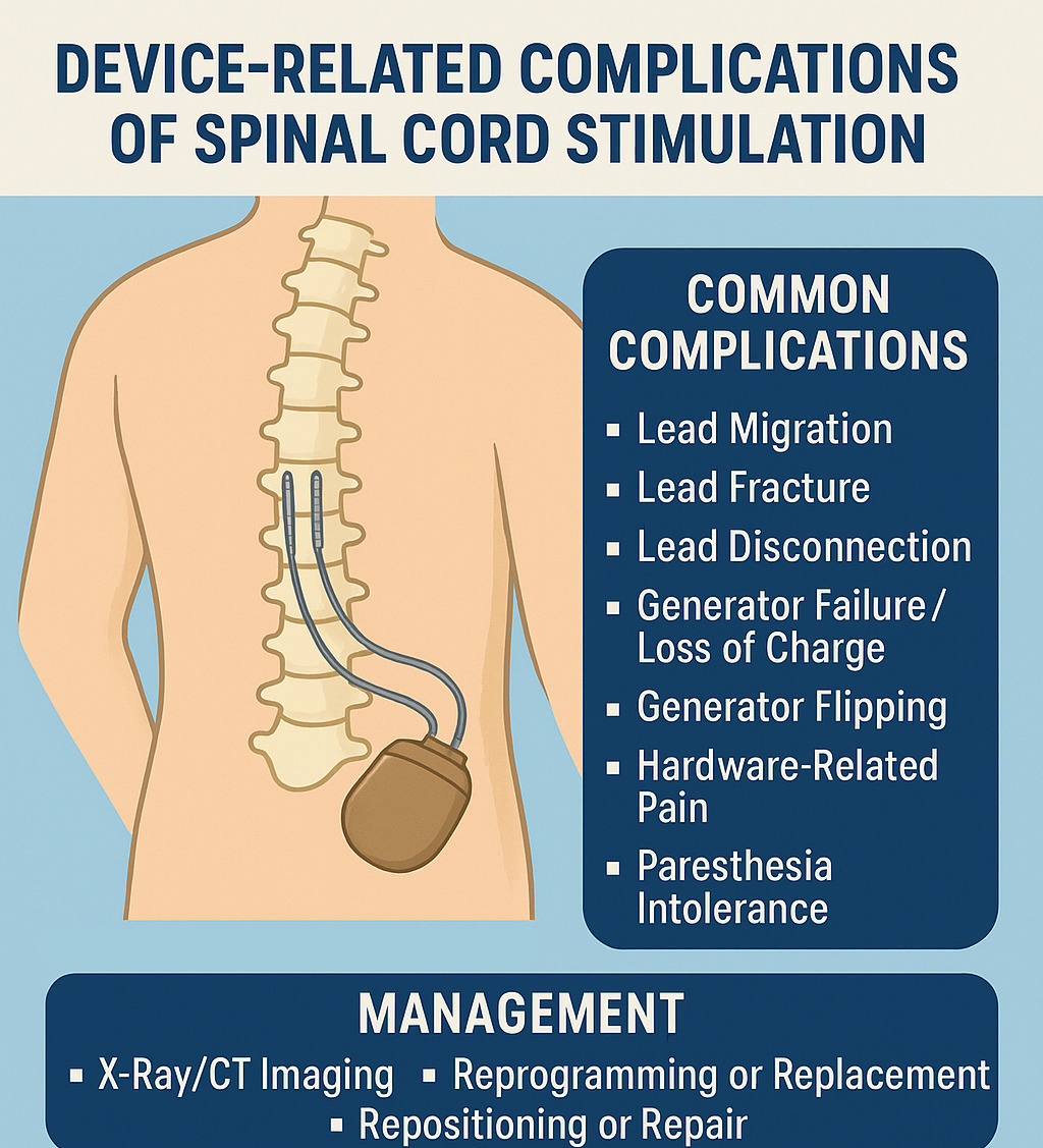 A comprehensive review of device-related complications from cylindrical lead spinal cord stimulator (SCS) implants was previously published. [1] Although SCS remains a minimally invasive treatment for neuropathic pain, hardware-related problems such as lead migration, lead fracture, lead disconnection, generator malfunction, loss of charge, generator flipping, pocket pain, and paresthesia intolerance are reported more often than biologic complications. [1,2] Understanding these issues, their clinical presentations, diagnostic evaluation, and management strategies is critical for long-term outcomes. This infographic was designed to present the key findings of the review in a clear and accessible visual format.