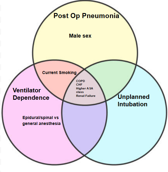 Significant independent predictors for postoperative pneumonia included male sex (OR 1.87, p<0.0001), chronic obstructive pulmonary disease (COPD) (OR 2.14, p<0.0001), congestive heart failure (CHF) (OR 1.45, p=0.0015), renal failure (OR 2.49, p<0.0001), higher ASA classification (p<0.0001), and current smoking (OR 1.21, p=0.0099). For ventilator dependence >48 hours, significant predictors were COPD (OR 2.49, p<0.0001), CHF (OR 1.26, p=0.0067), renal failure (OR 1.85, p<0.0001), higher ASA class (p<0.0001), smoking (OR 2.78, p<0.0001), and epidural or spinal anesthesia compared to general anesthesia (OR 2.61, p=0.0017). For unplanned intubation, COPD (OR 2.17, p<0.0001), CHF (OR 1.45, p=0.0015), renal failure (OR 2.49, p<0.0001), and higher ASA class were significant predictors (Figure 2). There is significant overlap between predictors, with COPD, CHF, higher ASA class, and renal failure being shared between each outcome (Figure 3).