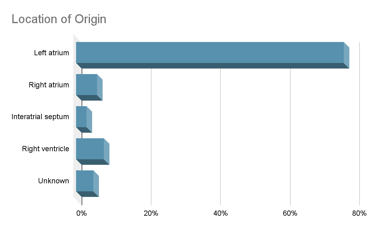 Intramural tumor extension can interfere with the cardiac conduction system, increasing the risk of cardiac arrhythmias.20 Other clinical manifestations may result from embolization, direct invasion, or compression of surrounding structures, leading to neurological deficits, palpitations, abdominal pain, or even claudication.