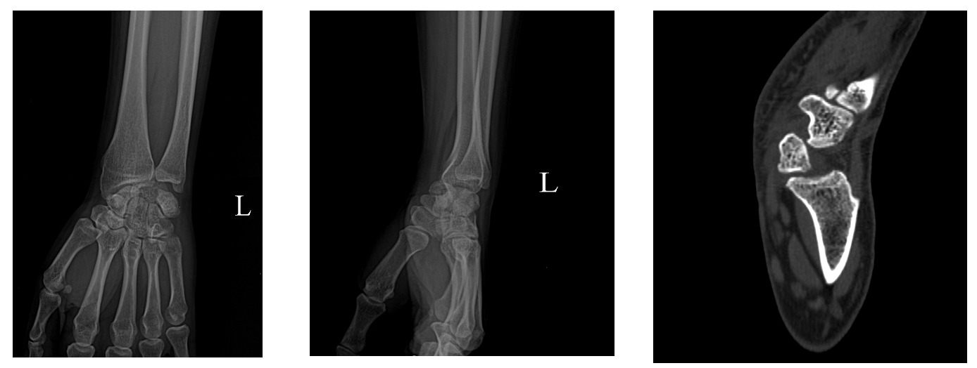 A 45-year-old woman sustained a left wrist injury in 2020 after a fall onto an outstretched hand. She was evaluated at a local facility, but a left lunate dislocation was missed. Two weeks prior to admission she developed atraumatic loss of active flexion of the left III and IV fingers. On examination, injury to the left flexor tendons of digits III and IV was suspected. Radiographs and CT scan demonstrated a volar dislocation of the lunate. The patient underwent surgery on October 1, 2024.