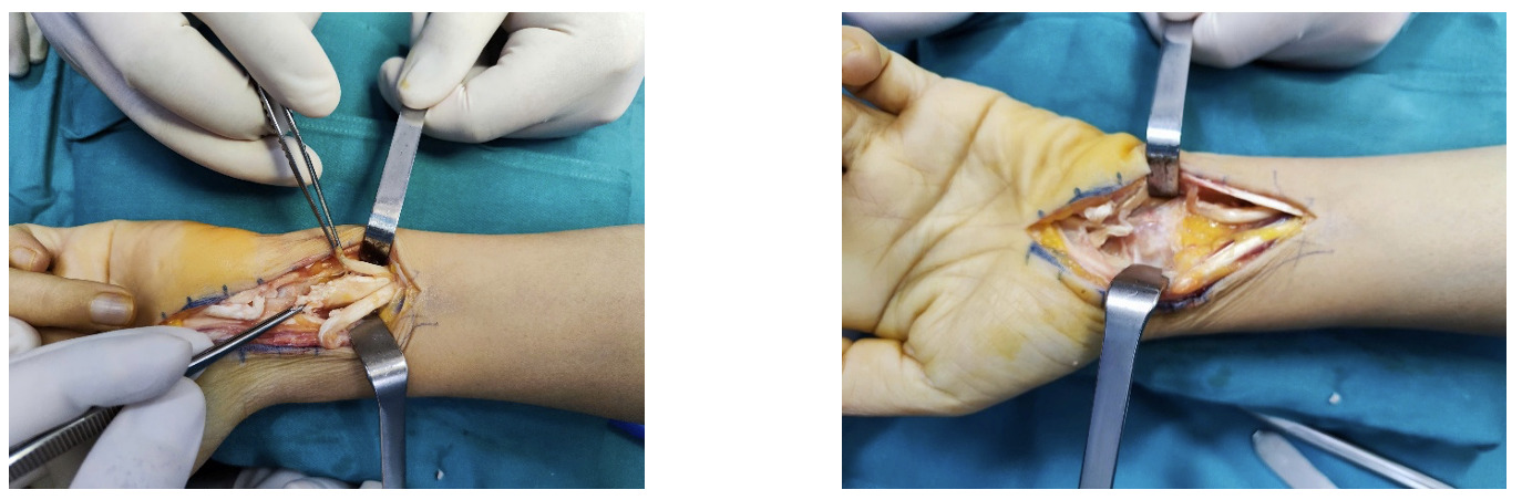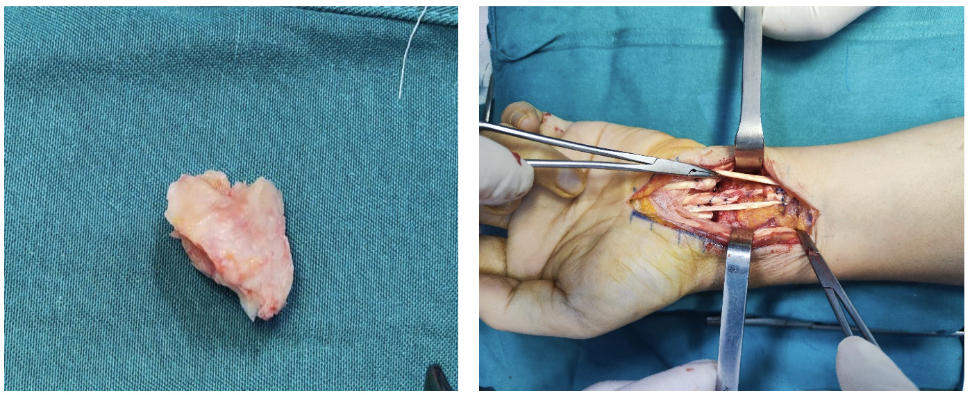 In our patient, the lunate dislocation had been neglected for 4 years. Preoperative radiographs and CT showed no radiocarpal degenerative changes. Intraoperatively, the FDS to digit IV had a short retraction with good tendon quality, allowing direct end-to-end repair; by contrast, the FDP to digits III and IV were retracted (~2 cm) with poor-quality ends. Accordingly, we performed lunate excision, direct repair of the FDS to digit IV, and reconstruction of the FDP to digits III and IV using an autologous palmaris longus tendon graft.