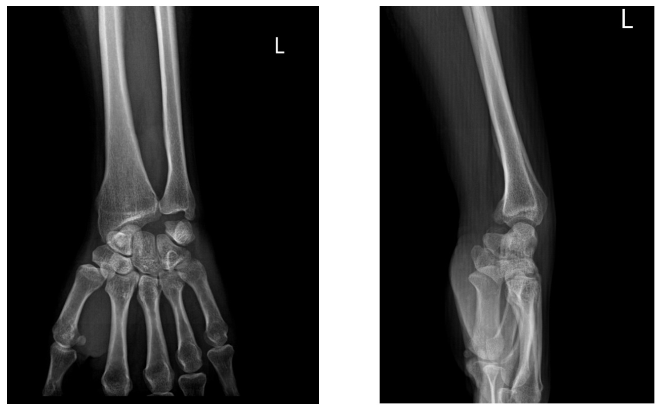 Postoperatively, the wrist and hand were immobilized in a short forearm cast for 4 weeks, followed by supervised rehabilitation focusing on digital flexion–extension. At 4 months and 1 year postoperatively, wrist flexion was 80° and extension 30°, and the digits achieved full active range of motion. Follow-up radiographs showed no radiocarpal degenerative changes.