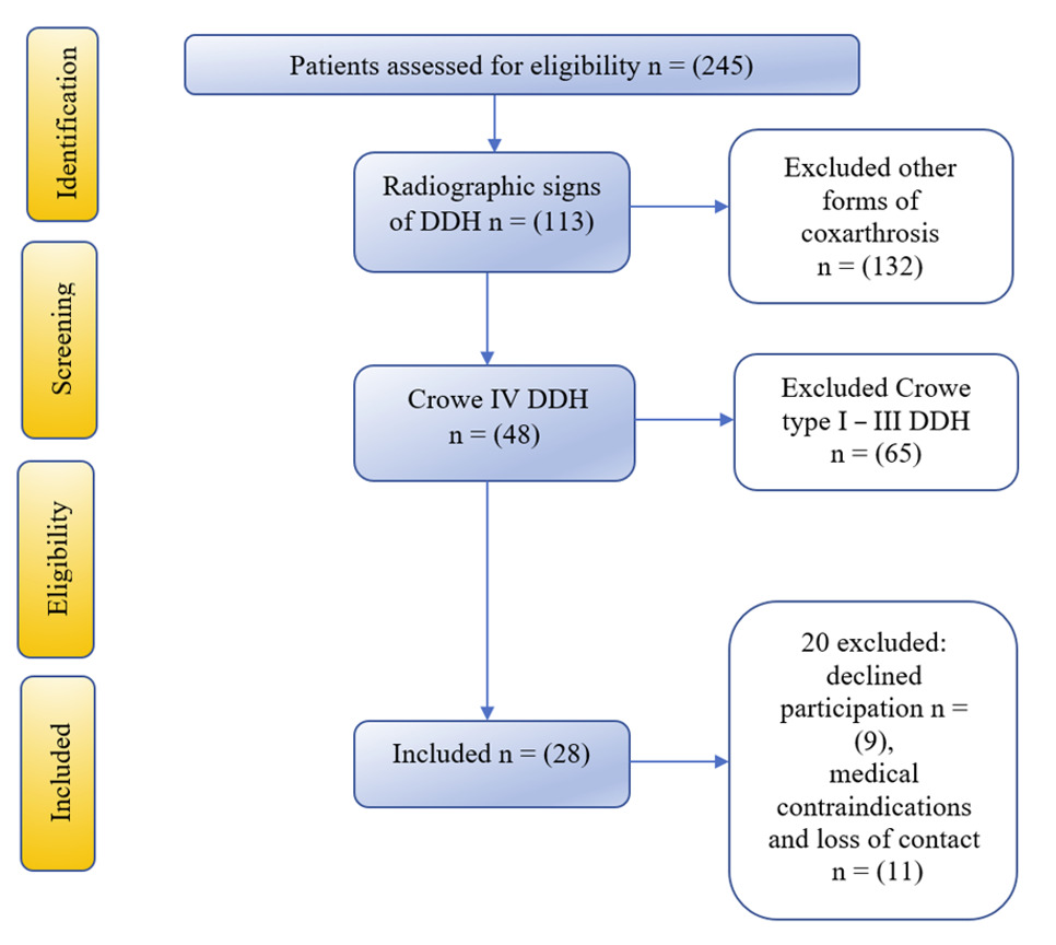 Between December 2022 and January 2024, a total of 245 patients with symptomatic hip osteoarthritis were screened for eligibility according to the inclusion criteria. At the initial stage, all patients underwent standard anteroposterior pelvic radiography. In 132 patients, other forms of coxarthrosis not associated with developmental dysplasia of the hip (DDH) were identified, and therefore they were excluded from further analysis. The remaining 113 patients demonstrated radiographic signs of DDH. Among them, 65 patients were diagnosed with Crowe type I–III dysplasia, which also did not meet the inclusion criteria. In 48 patients, Crowe type IV DDH was confirmed, defined as complete proximal displacement of the femoral head by ≥100% of the height of the pelvis on the affected side. The diagnosis was established according to the original classification of Crowe et al.36 For a detailed assessment of individual anatomical characteristics and preoperative planning, additional standing radiographs of the lower limbs and computed tomography (CT) scans of the pelvic ring with the proximal femur were performed. These data were used to analyze femoral canal morphology and to determine the parameters of individualized osteotomy. Among the 48 patients with confirmed Crowe type IV dysplasia, 9 declined participation after receiving complete information regarding the study objectives, protocol, and potential risks. Another 11 patients were excluded due to identified medical contraindications (including acute inflammatory conditions, severe anemia, coagulation disorders), as well as loss of follow-up contact with the research team. Ultimately, the final cohort included 28 patients who fully met the eligibility criteria and provided written informed consent to participate in the study.