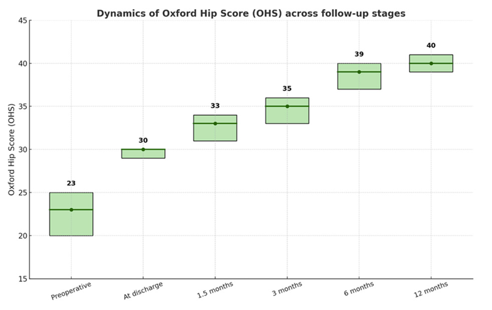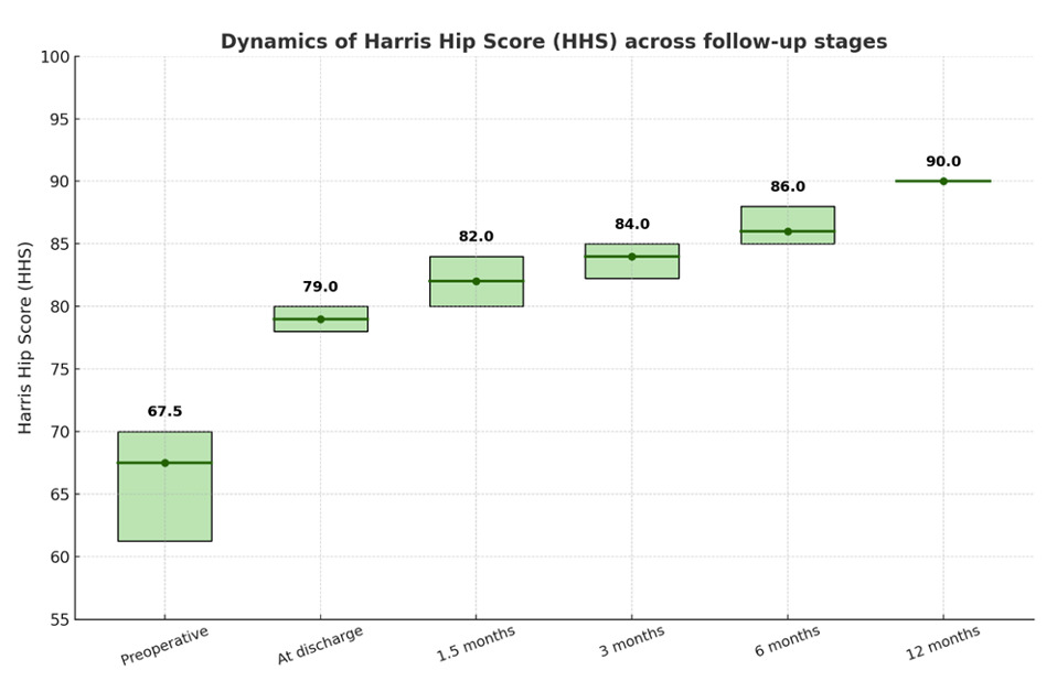 Throughout the perioperative period and the one-year follow-up, no major complications were recorded. There were no cases of infection, dislocation, implant migration, neurovascular injury, or nonunion of the osteotomy. The only intraoperative complication occurred in one patient (3.3%) — a fissure of the proximal femur during femoral component implantation. The complication was immediately managed with cerclage fixation, after which the postoperative course was uneventful: the osteotomy successfully healed, and no revision surgery was required. All patients completed the 12-month follow-up period.