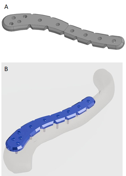 Surgical methods, including plate osteosynthesis and intramedullary fixation, are used to achieve anatomical reduction and to shorten rehabilitation time.4 However, intramedullary osteosynthesis is associated with complications such as infection, osteomyelitis, implant deformation or breakage, and insufficient fixation stability.5 Plate osteosynthesis is considered the gold standard, as it provides rigid fixation and rotational stability.6 Nevertheless, existing plate designs are often not well adapted to the anatomical curvature of the clavicle, necessitating intraoperative bending, which weakens the structural integrity and increases the risk of metal erosion.7 Additional risks are associated with empty screw holes near the fracture line, which reduce the overall fixation stability.8