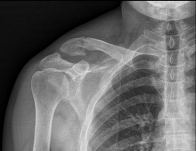 X-ray imaging demonstrated a displaced comminuted fracture of the distal clavicle (Figure 2), with the proximal fragment displaced superiorly. The fracture was classified as type IIb according to Neer.