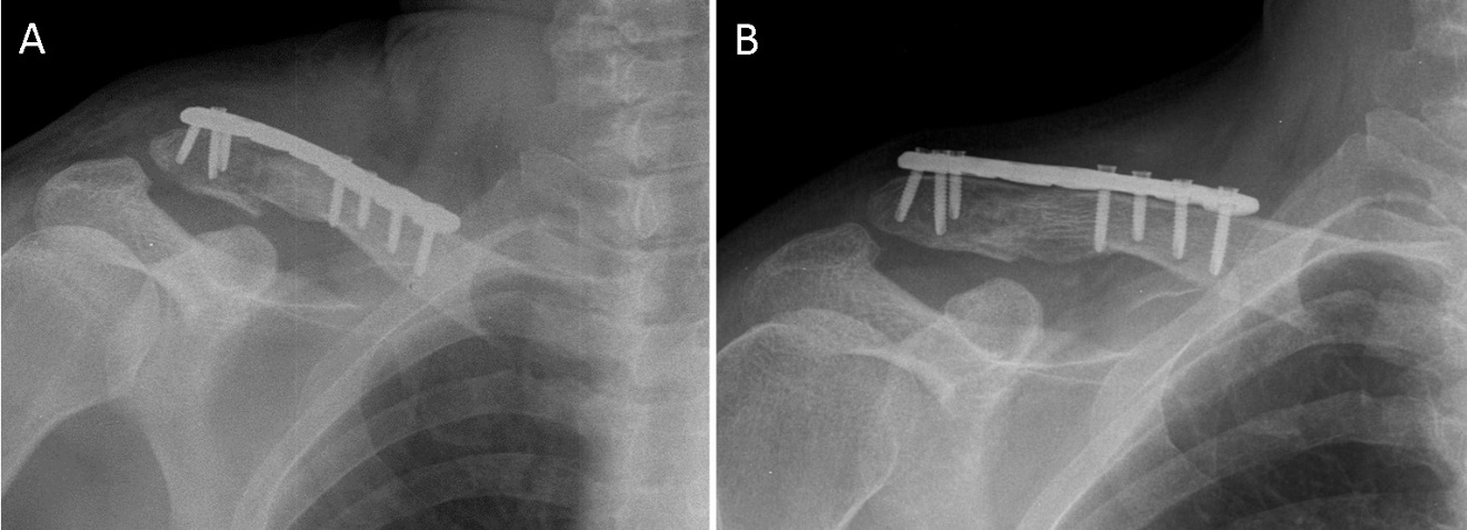 Type IIB fractures according to the Cho classification are particularly unstable due to coracoclavicular ligament disruption. In such cases, standard plate fixation may be insufficient, and combining plate fixation with ligament reconstruction yields better outcomes.18 Hook plates, although effective in some cases, are associated with acromioclavicular joint degeneration and a frequent need for implant removal.19