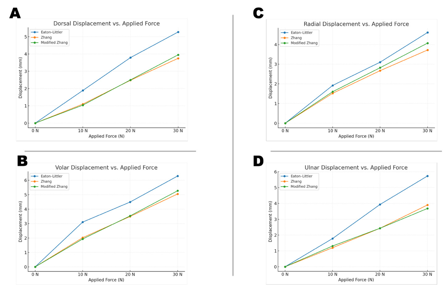 Testing was performed in four anatomical directions: dorsal (posterior), volar (anterior), radial (lateral), and ulnar (medial). Sequential loads of 10N, 20N, and 30N were applied in each direction using calibrated weights. The joint was returned to neutral position between measurements. Displacement was recorded as the change in position from the unloaded state.