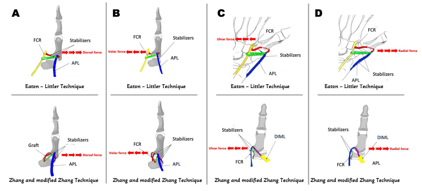 This study aimed to compare the biomechanical stability of the trapeziometacarpal joint following three ligament reconstruction techniques in a cadaveric model: the traditional Eaton-Littler method, the Zhang technique, and a modified Zhang technique utilizing a palmaris longus (PL) tendon graft .