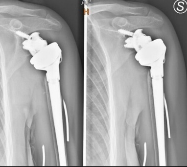 Post-operative radiographs confirmed appropriate implant positioning and restoration of length and version (Figure 2). The patient was placed in an abduction sling and followed a standardized rehabilitation protocol: passive assisted motion began at two weeks, with active exercises at six weeks and strengthening at three months. At three-month follow-up, pain had significantly improved, and active forward elevation reached 100°, with external rotation of 20°. There were no radiographic signs of loosening or migration.