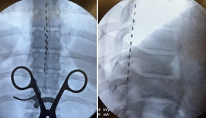 At follow-up after implantation, the patient continued to report >70% improvement in pain, further reduction in radicular symptoms, and enhanced functional mobility. She remained able to ambulate with a cane and had begun to walk independently for short distances. Her quality of life, mood, and overall activity level improved substantially. Images of the implant are shown below with one lead placed at the top of T7 with the second lead placed at the top of T8 slightly left of midline given her pain complaints (Figure 1).