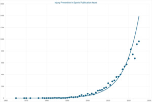 This bibliometric analysis underscores the rapidly expanding field of research on sports injury prevention. As shown by the exponential rise in publications on injury prevention in sports over the last few decades, sports-related injuries are now widely acknowledged as a public health issue that requires prevention efforts and further research. This is especially shown through 40% of all documents on injury prevention in sports being published within the last five years. This surge in interest on this issue is likely due to an increase in the participation and sports as well as advancements in our knowledge of the long-term physical, mental, and economic impacts that sports injuries can result in. This is especially seen with certain studies that highlight the risk factors associated with sport participation and how future methods can be adapted to drive more research and prevention strategies in the field.20