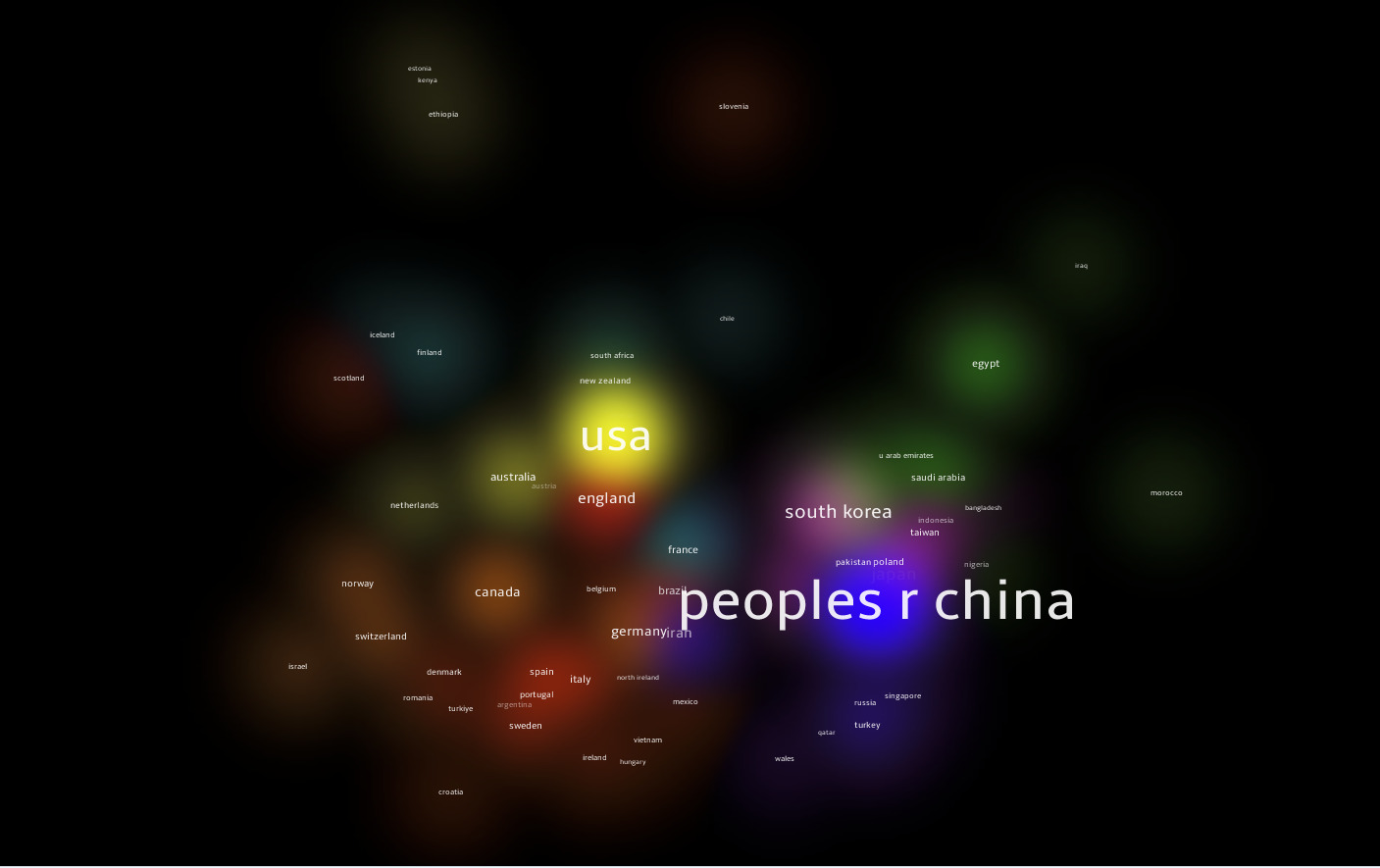 Smaller numbers of publications were observed for countries such as Australia, France, Germany, Italy, Spain and the Netherlands and they demonstrated some degree of collaboration with other countries within the dataset. Conversely, several geographic areas, including parts of Africa, the Middle East and South America have small or no node representation suggesting low levels of publication and few international collaborations with other countries within the dataset.