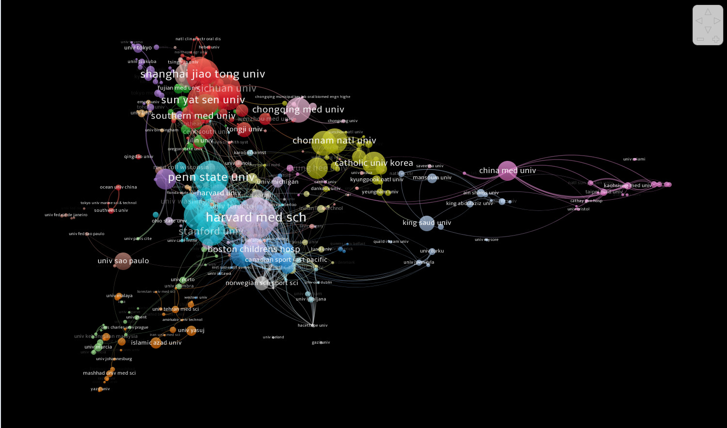 International institutions form additional collaborative clusters within the network. Universities such as Shanghai Jiao Tong University, Sun Yat-sen University, Chongqing Medical University, and Southern Medical University represent significant contributors within Asian research clusters. Catholic University of Korea and Chonnam National University also appear as key nodes, indicating active participation in research related to energy deficiency and athlete health.