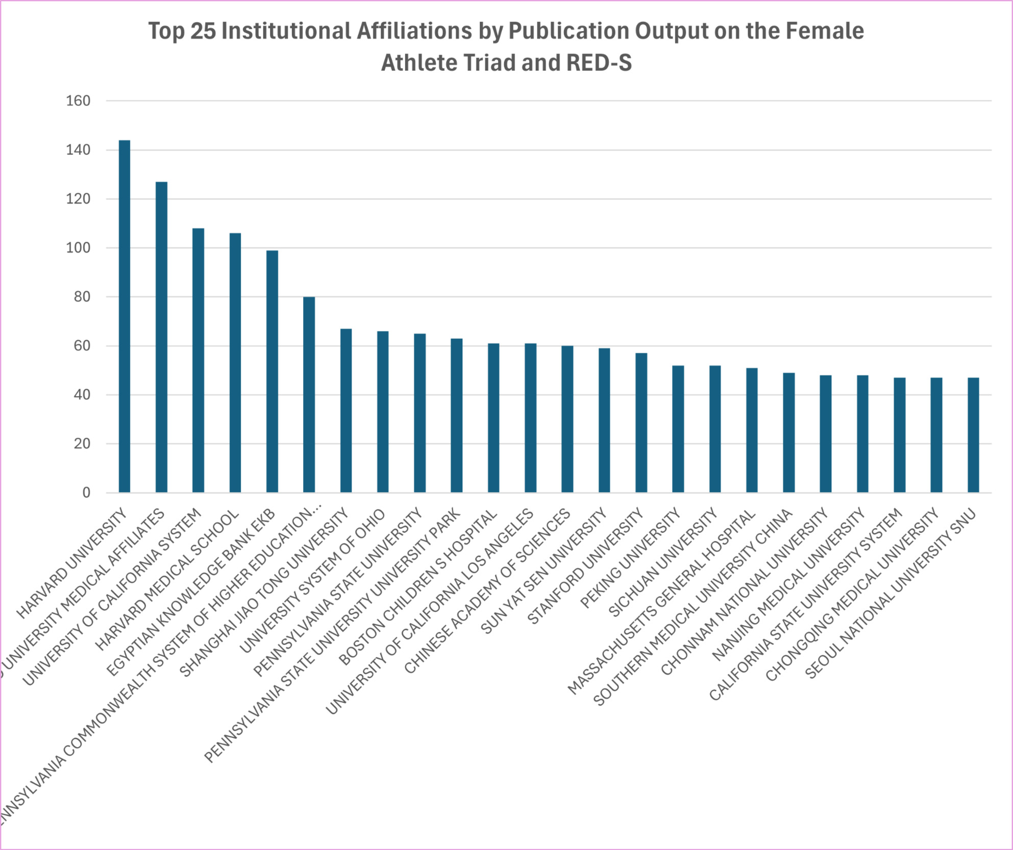 The figure shows the top 25 institutional affiliations for publications regarding Female Athlete Triad and RED-S, and it shows that the majority of the research has been conducted at a small number of academic and medical institutions.