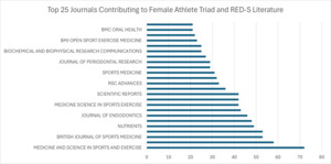 Medicine and Science in Sports and Exercise has published the most articles in this area, therefore it is likely the most important outlet for research about the health of athletes and their energy levels. There are also other highly productive outlets, including the British Journal of Sports Medicine, Nutrients, Journal of Endodontics, and Medicine Science in Sports and Exercise. These four journals combined publish an enormous amount of literature concerning the Female Athlete Triad and RED-S.