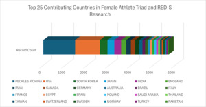 Figure 5 shows which of the top 25 most publishing countries contributed to studies on the Female Athlete Triad & RED-S. The country distribution is indicative of how a few top-25 countries produce an overwhelming majority of the total publications found in this data set.