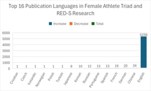 As demonstrated in Figure 9, the top 16 publication languages shown for research relating to the Female Athlete Triad and RED-S show an overwhelming representation of English.