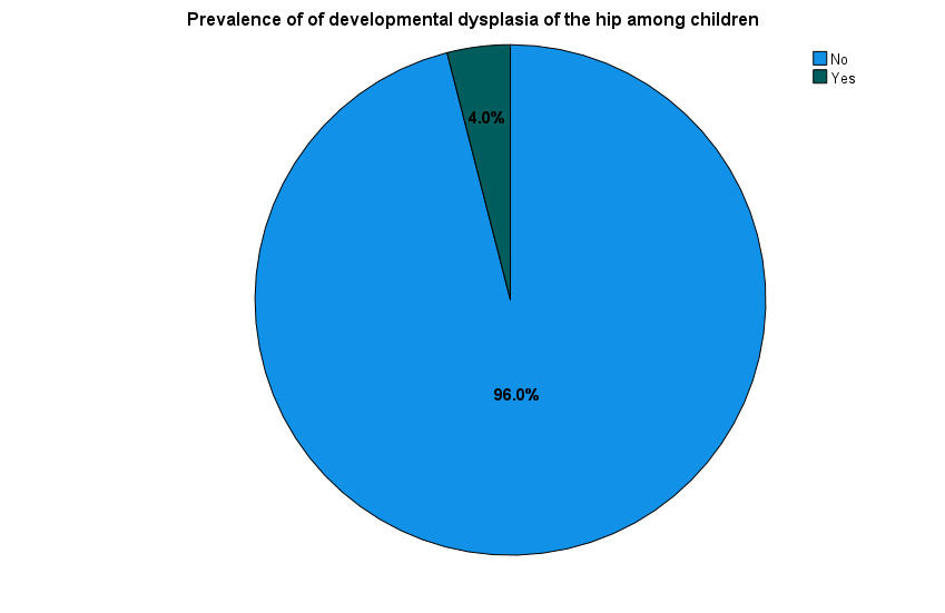 Figure 1 illustrates the prevalence of developmental dysplasia of the hip among children. The study reported 16 cases (4.0%) of DDH in children, while the majority, 385 (96.0%), reported no cases of DDH in children.