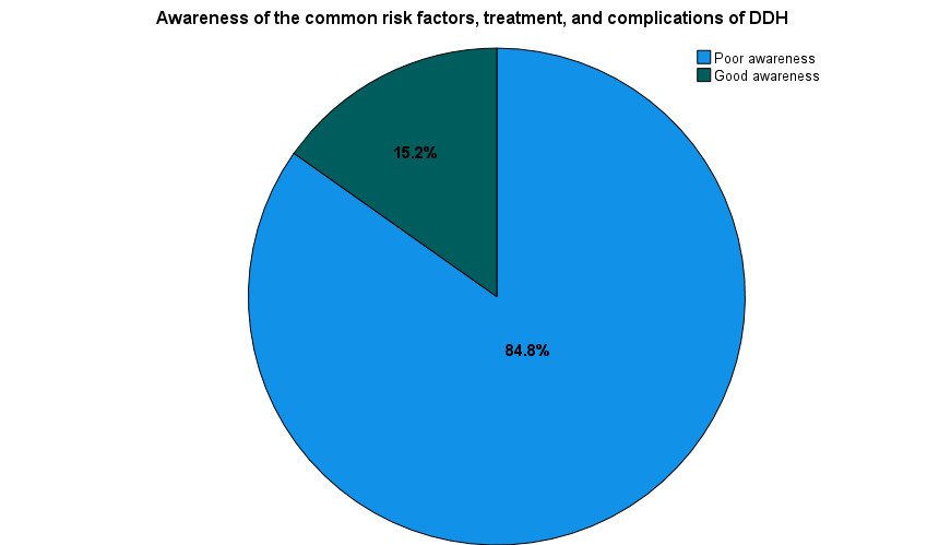 Despite the clinical importance of DDH, there is a scarcity of studies conducted in Northern Saudi Arabia that address the condition and its associated health outcomes.10 Limited awareness persists regarding its causes, treatment options, and potential complications among the general population.11,12 Evidence further suggests that awareness tends to be higher among multiparous mothers or those with a child previously diagnosed with DDH.13