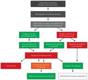 The patient exhibited many features consistent with the American Society of Anesthesiologists (ASA) predictors of a difficult airway, including thyromental distance and mouth opening of less than three finger breadths, along with Mallampati class >2.4 These findings likely stem from his craniofacial hypoplasia following childhood treatment for sinus cancer, with radiation-induced fibrosis contributing to trismus and other possible anatomical variations affecting airway management.5 As a result, using conventional modalities such as direct laryngoscopy was not feasible.6 Craniofacial abnormalities are also associated with a 31% incidence of upper airway obstruction at induction and a 25% rate of difficult bag-valve-mask (BVM) ventilation.2 Additionally, anatomically difficult airways are less likely to have first-attempt intubation, with each subsequent attempt increasing the risk of airway trauma, severe hypoxia, and cardiac arrest.7,8 When difficult BVM ventilation is combined with failed intubation, patients are faced with a 67% chance of multiple attempts.3 Moreover, patients who receive radiation for head and neck cancer may develop radiation-induced cranial nerve injury years later, predisposing them to airway obstruction following extubation.9 By opting for spinal anesthesia, we minimized the risks encountered during airway manipulation. Patients who are high-risk for difficult mask ventilation or intubation should be considered for RA10 (Figure 2).