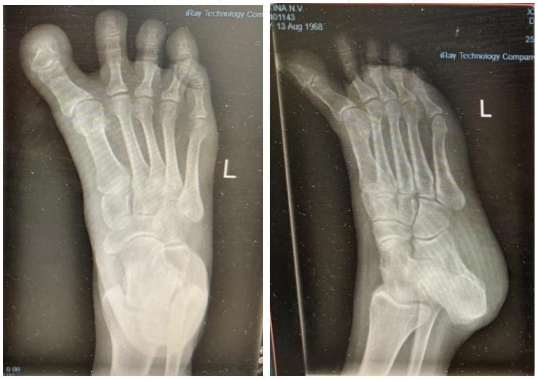 A standardized rehabilitation protocol was initiated in the second postoperative week. It included passive and active range of motion exercises targeting the first metatarsophalangeal (MTP) joint to restore mobility. Patients also performed strengthening exercises aimed at reactivating the intrinsic muscles of the foot. Gait training was conducted under the supervision of a physiotherapist to ensure proper walking mechanics. Additionally, physiotherapy modalities such as low-intensity pulsed magnetic therapy were used to reduce soft tissue swelling and promote tissue healing.