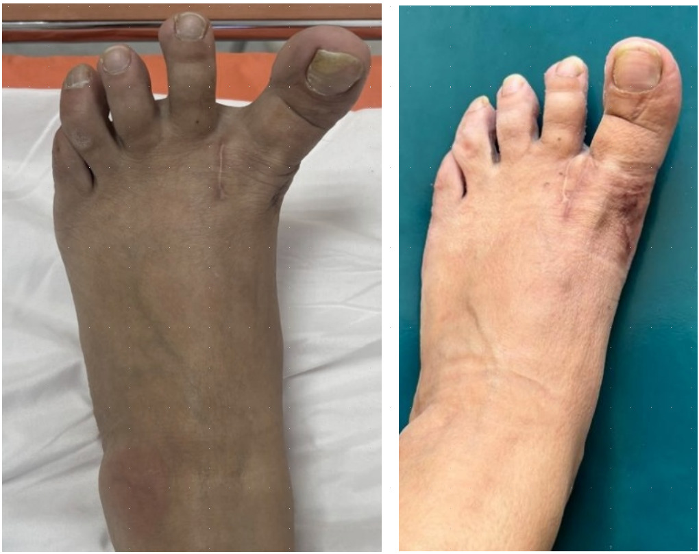 All patients expressed subjective improvement in foot function, pain, and appearance. Five patients rated their outcomes as “completely satisfied,” and two were “satisfied with minor concerns.” No dissatisfaction or requests for additional surgical revision were recorded. Representative pre- and postoperative clinical photographs illustrating cosmetic improvement in toe alignment are shown in Figure 3.
