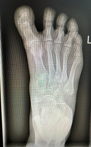 Postoperative care followed a standardized rehabilitation protocol. The hallux was immobilized in a neutral position using a toe splint. Starting from the second postoperative day, patients were allowed partial weight-bearing using a rigid-soled postoperative shoe (such as Barouk) designed to offload the forefoot. Skin sutures were removed on day 12. Patients continued wearing orthopedic shoes for the following 4–5 weeks, after which they gradually transitioned to soft, comfortable footwear for an additional 7–8 weeks. Return to regular footwear and full weight-bearing was typically permitted approximately 12 weeks after surgery.