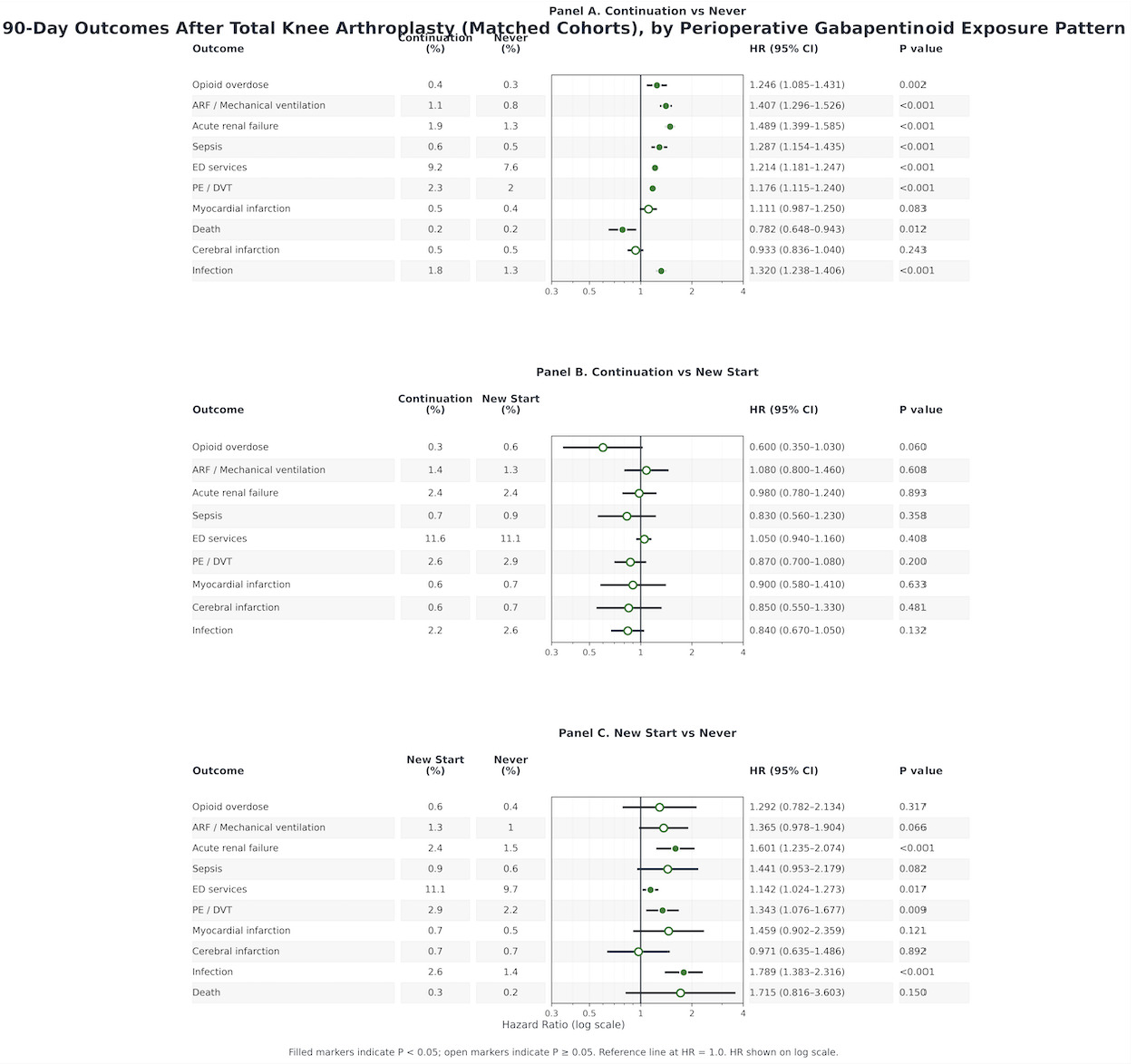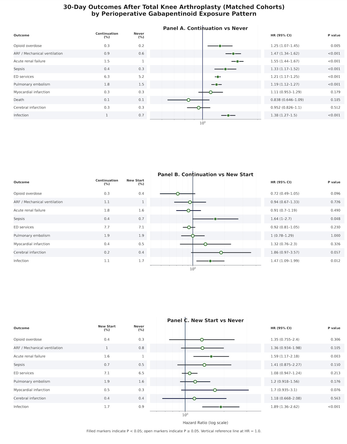 Accordingly, using a large national federated electronic health record (EHR) network and propensity score matching, this study compared 30 and 90-day postoperative outcomes after total knee arthroplasty across three mutually exclusive perioperative gabapentinoid exposure patterns (continuation vs never, continuation vs new start, and new start vs never). We hypothesized that perioperative gabapentinoid exposure would be associated with higher rates of opioid-related and respiratory adverse events, with the greatest risk among patients newly initiated around the time of surgery.
