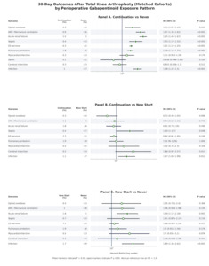 In contrast, most 30-day outcomes were similar between continuation and new-start users. Continuation users showed no statistically significant differences in opioid overdose (0.3% vs 0.4%; RR 0.72, 95% CI 0.49-1.06), acute respiratory failure requiring mechanical ventilation (1.1% vs 1.0%; RR 0.94, 95% CI 0.67-1.32), acute renal failure (1.8% vs 1.6%; RR 1.00, 95% CI 0.82-1.22), emergency department utilization (7.7% vs 7.1%; RR 0.93, 95% CI 0.82-1.05), pulmonary embolism (1.9% vs 1.9%; RR 1.00, 95% CI 0.78-1.28) relative to new-start patients, with risk ratios generally close to 1.00 and confidence intervals crossing unity. However, continuation therapy was associated with a higher 30-day risk of postoperative infection compared with new initiation (1.1% vs 1.7%; RR 1.47, 95% CI 1.09-1.98).