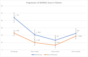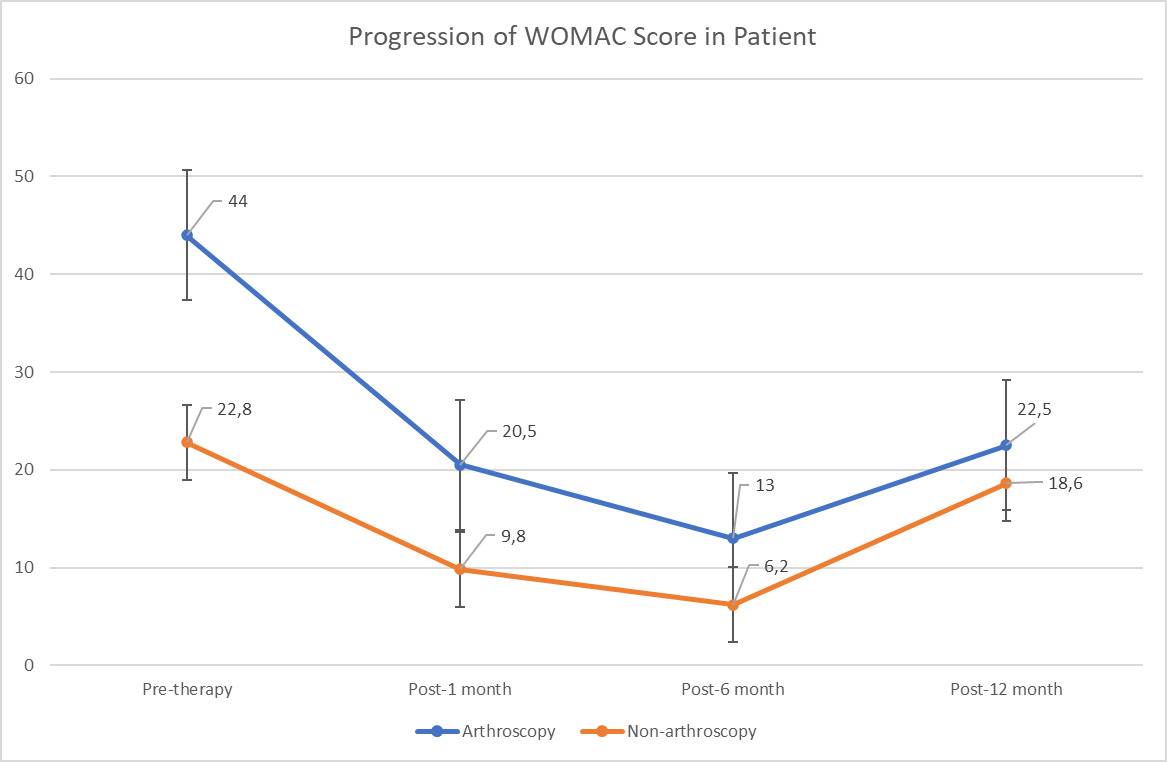 Both treatment groups demonstrated reductions in WOMAC scores, indicating improved functional outcomes. VAS scores were excluded due to inconsistent reporting and missing data; therefore, WOMAC scores were used as the primary outcome. Patients who underwent arthroscopy showed initial WOMAC values of 40 and 48, which improved to 9 and 32 at 1 month, further decreased to 2 and 24 at 6 months, but partially worsened to 10 and 35 at 12 months. In the non-arthroscopy group, baseline WOMAC values ranged from 15 to 32, with consistent reductions across all patients at 1 month (scores 0–12) and 6 months (0–18). By 12 months, four of the five patients demonstrated sustained or improved functional recovery, with WOMAC scores ranging from 0 to 53.