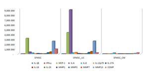 The culture medium that contains secretome, the set of molecules released by stem cells, is referred to as conditioned medium (CM)29-30. In contrast to the concentration of biomarkers co-cultured with UC-MSCs, SF-MSCs co-cultured with CM actually showed a significant decrease in the levels of interleukins, MMPs, and COMP as shown in the result. This is consistent with previous reports demonstrating that MSC-derived secretomes possess a distinct molecular profile compared to other secretomes. Specifically, they are enriched with angiogenic factors, contain lower levels of MMPs, and exhibit high production of TGF-β, chemokines, and anti-inflammatory cytokines. Such a composition makes the UC-MSC secretome a potent driver of inflammation regulation, which may explain the biomarker reduction observed in our findings. Another study by Lee et al., (2024) stated that SF-UC-MSC conditioned media effectively reduced IL-6 levels, a proinflammatory biomarker. Lee also mentioned that SF-UC-MSC conditioned media downregulates COX-2 gene expression, an enzyme that promotes inflammation.29