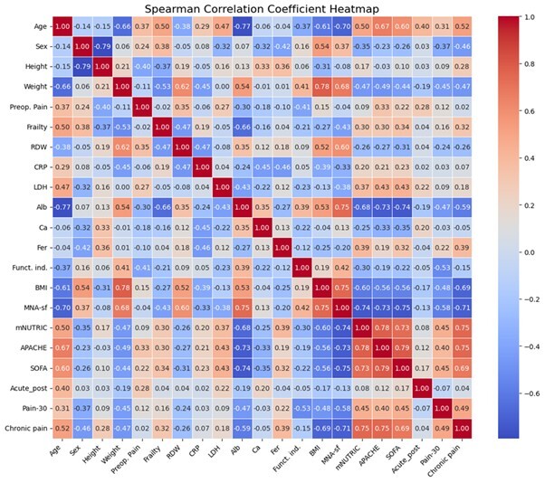 Chronic pain at six months demonstrated the strongest associations in the study, particularly with pain at 30 days, hypoalbuminemia, frailty, Fer levels, BMI and illness severity scores. These findings strongly support current models of chronic postsurgical pain emphasizing the interaction between early pain trajectories, inflammation and patient vulnerability.3,17 The strong inverse association between Alb and chronic pain highlights the central role of nutritional and inflammatory status in pain chronification. Hypoalbuminemia has been linked to chronic inflammation, sarcopenia and impaired musculoskeletal repair, all contributing to persistent pain.11,16,18 Fer, as an acute-phase reactant, has been associated with chronic inflammatory pain states, supporting its observed relationship with long-term pain.20 Frailty’s association with chronic pain is consistent with evidence that frail individuals have reduced adaptive capacity and altered pain processing, increasing susceptibility to persistent pain syndromes.2,10,15 The strong negative correlation between BMI and chronic pain likely reflects the impact of sarcopenia and undernutrition on musculoskeletal integrity and pain persistence.7,11,18 The particularly strong associations between chronic pain and APACHE and SOFA scores suggest that perioperative physiological derangement has long-lasting effects on pain outcomes. Although traditionally used to predict mortality and organ dysfunction, emerging evidence indicates that these indices also reflect vulnerability to long-term disability and pain.29