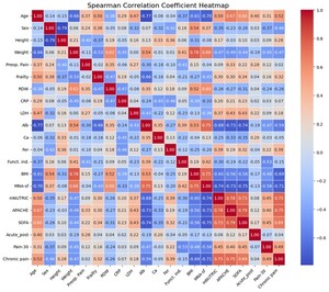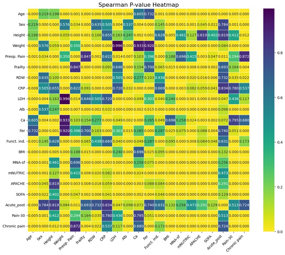 A total of 80 patients were included in the study. The analysis investigated associations among various input clinical variables (MNA-sf, mNUTRIC, APACHE, SOFA, level of frailty, RDW, CRP, LDH, Ca, Fer and Alb) as well as their relationships with target postoperative pain outcomes (presurgery pain, acute postsurgery pain, pain at 30 days postsurgery and chronic pain at six months) and functional independence after discharge. The strength of these associations was quantified using Spearman’s rank-order correlation coefficient, with statistical significance determined by p values. The results obtained using heatmaps are shown in Figures 1 and 2.