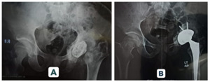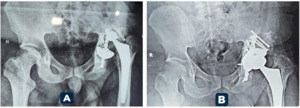 All patients began physiotherapy on the first postoperative day. Partial weight bearing was maintained for 6–12 weeks, with progression to full weight bearing guided by clinical and radiographic evidence of stability. Standard infection and thromboembolism prophylaxis was administered, alongside routine wound care, inpatient monitoring, and scheduled radiographic follow-up to assess osseointegration and component fixation.
