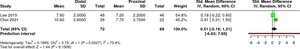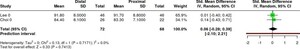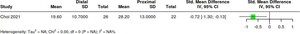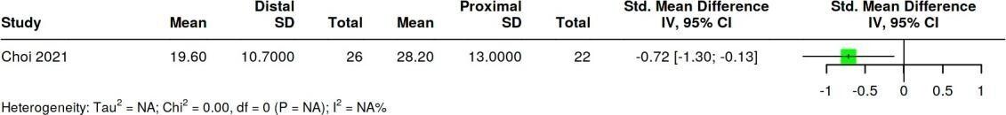 Conclusion: 0.14 [95% CI: −0.86 to 1.15], with I² = 87.3%, indicates that the combined effect of the two studies shows no significant difference between the distal and proximal groups. The very wide confidence interval that crosses zero indicates no clear effect, and the high I² value indicates substantial heterogeneity, meaning that the results of the two studies are inconsistent and the findings between studies are unstable (Table 5).