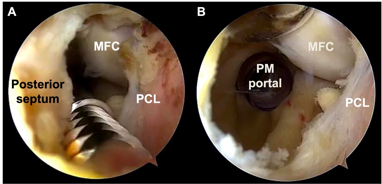 Arthroscopic surgery was performed under spinal anesthesia with the patient in the supine position and a thigh tourniquet applied. Standard anterolateral (AL) and anteromedial (AM) portals were established for initial diagnostic arthroscopy. Intra-articular evaluation confirmed displaced tibial avulsion fractures of both the ACL and PCL. For fixation of the PCL tibial avulsion, FiberTape® (Arthrex, Naples, FL, USA), an ultrahigh-strength 2-mm-wide tape incorporating the FiberWire® structure, was used in combination with a SwiveLock® anchor (Arthrex, Naples, FL, USA). Posteromedial (PM) and posterolateral (PL) portals were created, followed by establishment of a posterior trans-septal portal (Fig 2) to allow direct visualization of the posterior compartment and the PCL tibial footprint (Fig 3A). Hematoma and interposed fibrous tissue were debrided, and the bone bed was prepared to facilitate anatomic reduction (Fig 3B).