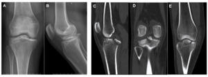 A 33-year-old woman, previously healthy and without any prior history of knee trauma or pre-existing joint disease, presented with right knee pain and swelling 8 days after a motor vehicle accident. Before presentation to our institution, she had been managed conservatively with rest and analgesics only, without immobilization or invasive intervention.
