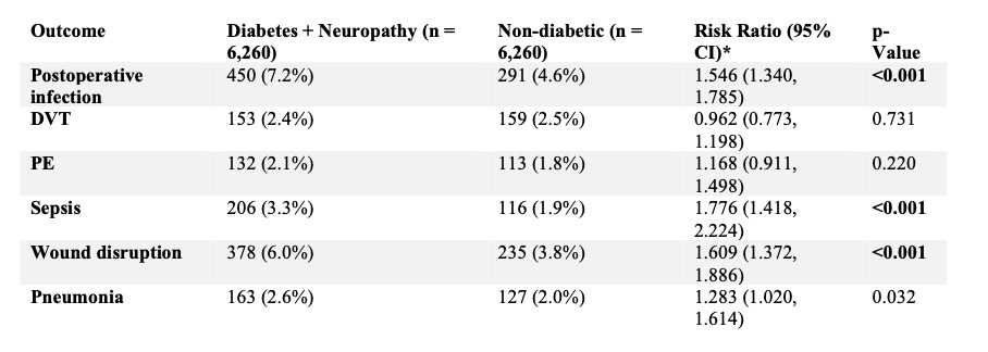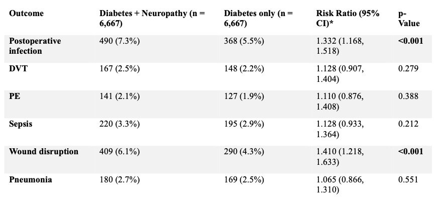 Following matching, 6,260 patients were included in each cohort with adequate balance across baseline covariates (Tables 2, 6, and 7). Within ninety days, patients with diabetic neuropathy experienced higher rates of postoperative infection (7.2% vs 4.6%; RR 1.55, 95% CI 1.34–1.79; p < 0.001), sepsis (3.3% vs 1.9%; RR 1.78, 95% CI 1.42–2.22; p < 0.001), wound disruption (6.0% vs 3.8%; RR 1.61, 95% CI 1.37–1.89; p < 0.001), and pneumonia (2.6% vs 2.0%; RR 1.28, 95% CI 1.02–1.61; p = 0.03). Rates of DVT (2.4% vs 2.5%; RR 0.96, 95% CI 0.77–1.20; p = 0.73) and PE (2.1% vs 1.8%; RR 1.17, 95% CI 0.91–1.50; p = 0.22) were not significantly different. (Table 6)