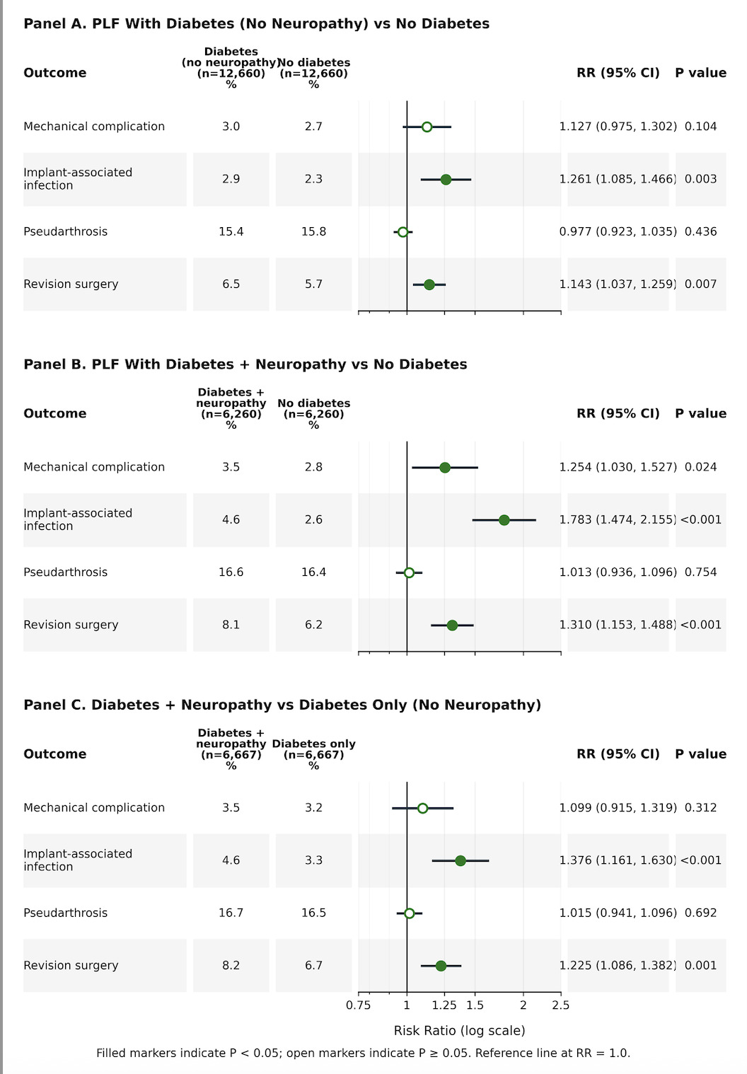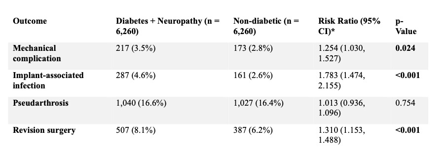 At two years, patients with neuropathy demonstrated higher rates of mechanical complications (3.5% vs 2.8%; RR 1.25, 95% CI 1.03–1.53; p = 0.02), implant-associated infection (4.6% vs 2.6%; RR 1.78, 95% CI 1.47–2.16; p < 0.001), and revision surgery (8.1% vs 6.2%; RR 1.31, 95% CI 1.15–1.49; p < 0.001). Pseudarthrosis rates were similar (16.6% vs 16.4%; RR 1.01, 95% CI 0.94–1.10; p = 0.75). (Table 7)