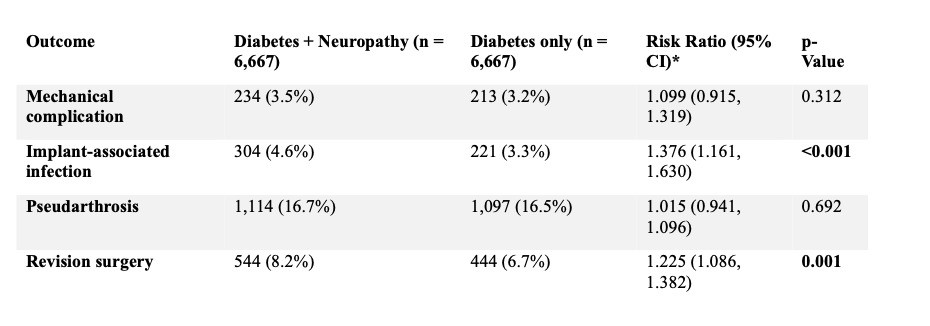 When diabetic patients with and without neuropathy were compared directly, neuropathy remained associated with higher rates of early postoperative infection (7.3% vs 5.5%), wound disruption (6.1% vs 4.3%), and implant associated infection (4.6% vs 3.3%). At two years, patients with neuropathy demonstrated higher rates of revision surgery (8.2% vs 6.7%) and implant associated infection (4.6% vs 3.3%), while mechanical complications and pseudarthrosis were comparable between diabetic cohorts.
