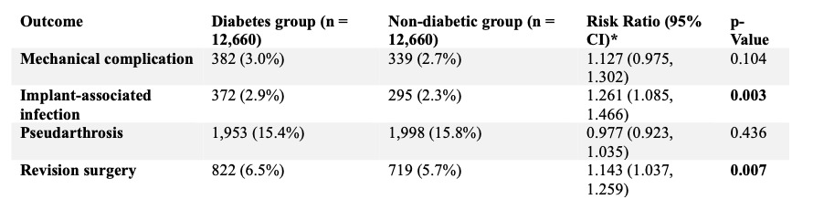 At two years, diabetic patients without neuropathy demonstrated higher rates of implant-associated infection (2.9% vs 2.3%; RR 1.26, 95% CI 1.09–1.47; p = 0.003) and revision surgery (6.5% vs 5.7%; RR 1.14, 95% CI 1.04–1.26; p = 0.007), whereas rates of mechanical complications (3.0% vs 2.7%; RR 1.13, 95% CI 0.98–1.30; p = 0.10) and pseudarthrosis (15.4% vs 15.8%; RR 0.98, 95% CI 0.92–1.04; p = 0.44) were comparable. (Table 5)