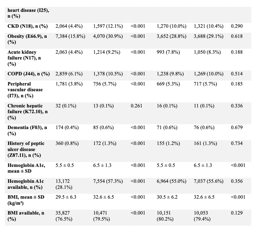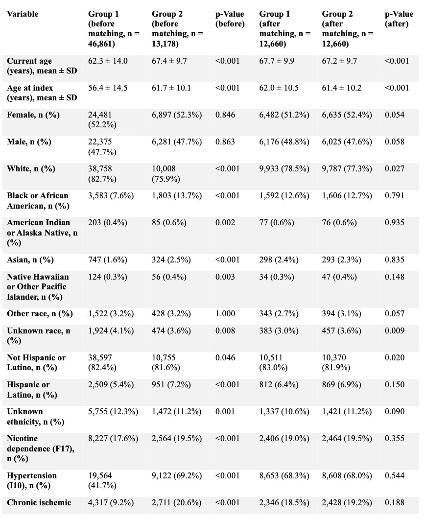 After propensity score matching, 12,660 patients were included in each cohort with no clinically meaningful differences in baseline characteristics (Tables 1, 4, and 5).