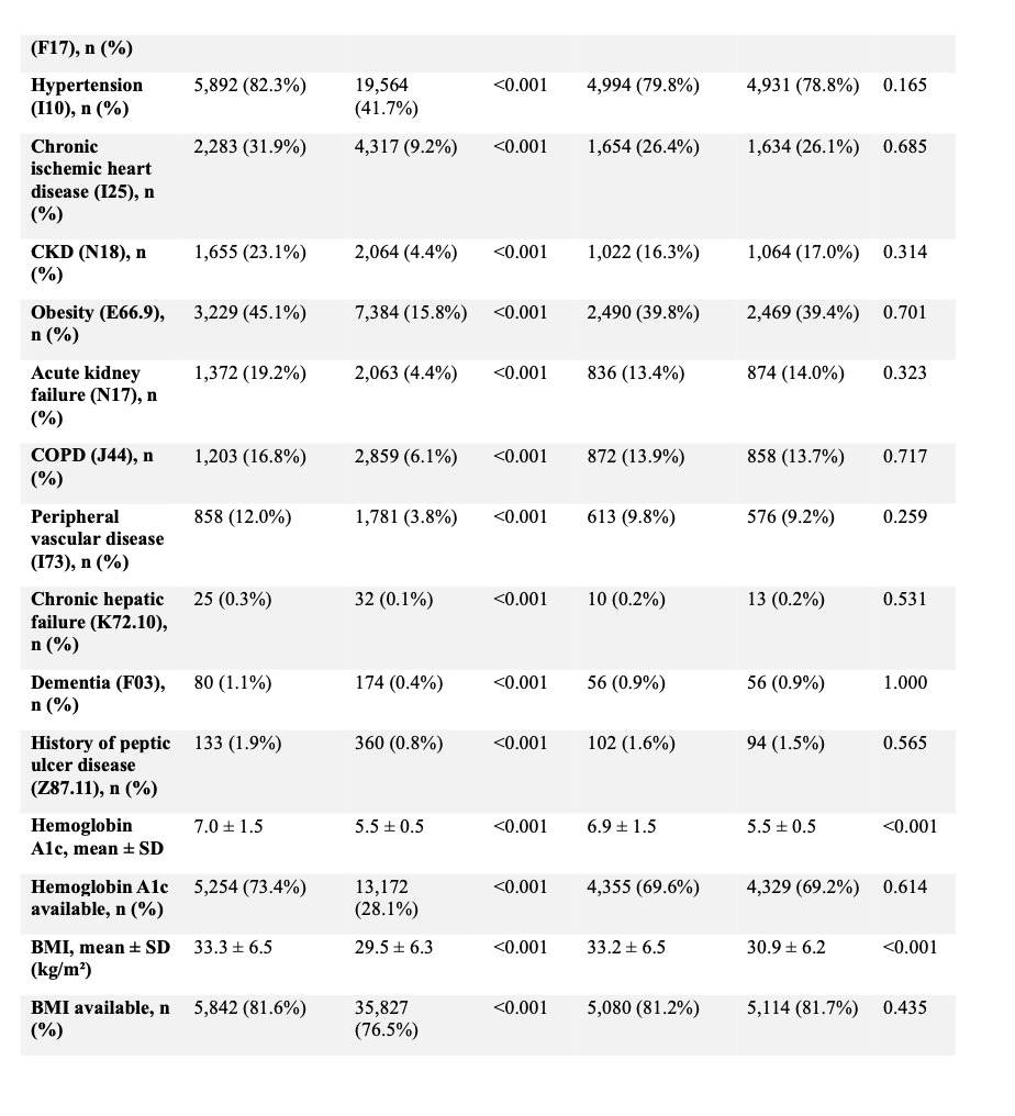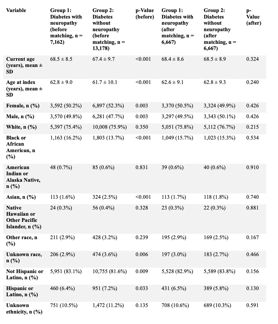 To account for baseline differences in demographics and comorbidities, propensity score matching was performed for three separate comparisons: (1) diabetic without neuropathy vs non-diabetic patients, (2) diabetic with neuropathy vs non-diabetic patients, and (3) diabetic with neuropathy vs diabetic without neuropathy. Matching was conducted using a 1:1 nearest-neighbor algorithm with a caliper width of 0.1 pooled standard deviations. Covariate balance after matching was assessed using standardized mean differences, with values <0.1 considered indicative of adequate balance; p-values are reported to describe residual differences. (Tables 1-3).