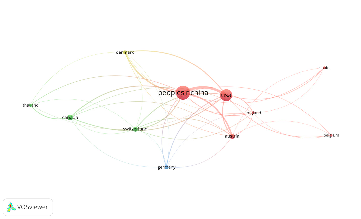 The international collaboration network analysis is shown in Figure 3. The nodal size indicates the number of publications issued in a specific country, and the lines between nodes represent the frequency of cooperation between countries. Several clusters were obtained based on this information. As shown in Figure 3, China was the main driving force with a high academic reputation in this research field, which was confirmed by the following characteristics: number of publications (19), total number of citations (893), and total link strength (83). Denmark had the highest number of citations per publication (CPP: 70.50). The total number of research publications from other countries, such as the USA, Austria, Canada, and Switzerland, was relatively low. However, their publication output still reflected the considerable progress made by these countries in this field, which was closely related to their collaborations with China.