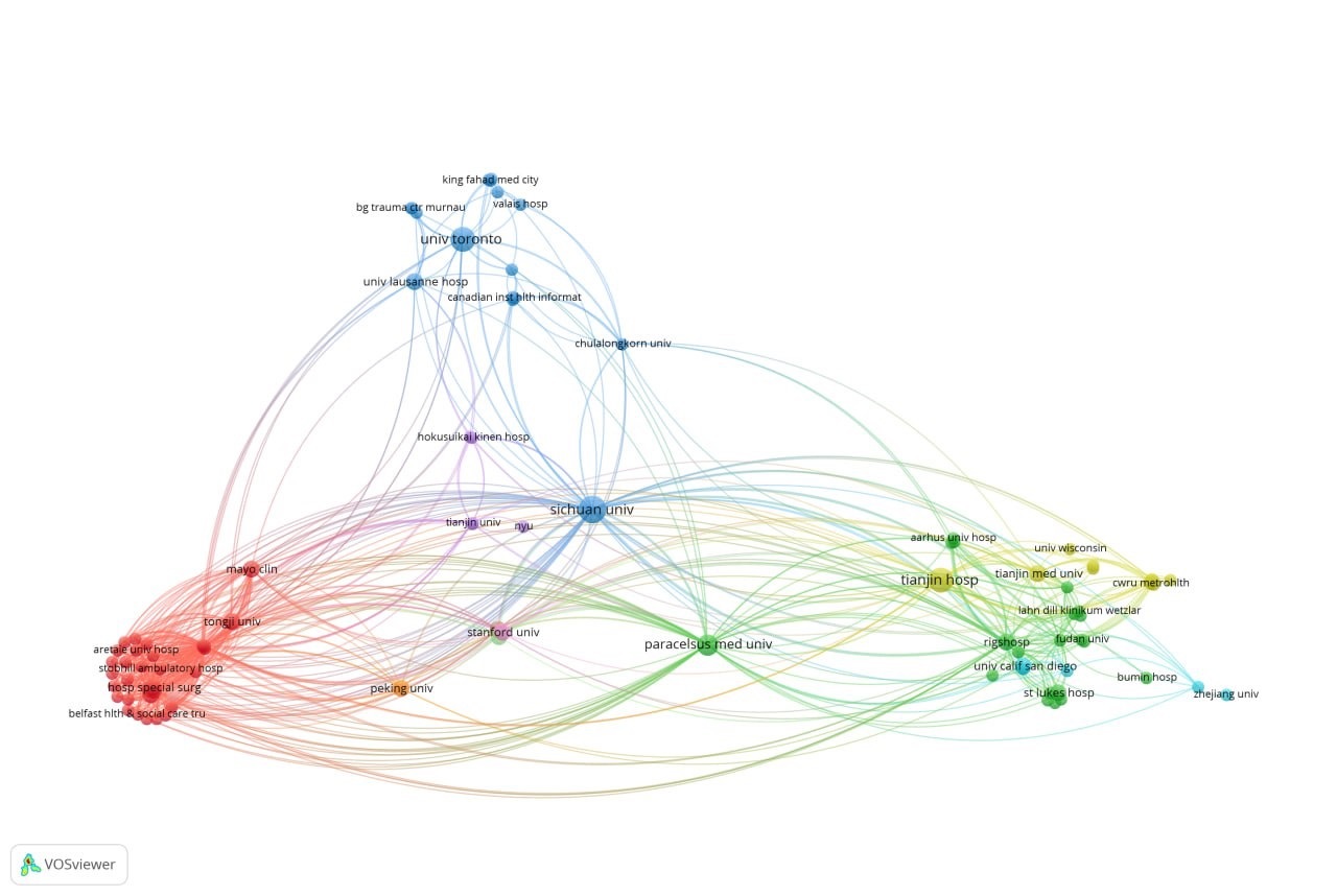 All publications were distributed among various institutions, with the top 10 most productive institutions ranked based on their research publications, citations, and total link strength. The most productive institution was Sichuan University, with 5 publications (18% of the total analyzed articles), while most other institutions produced between 2 to 4 publications each. The institution with the highest overall citation count was the University of California, San Diego (UCSD), with 158 citations. UCSD also had the highest citations per publication (79), underscoring the strong influence of its research. Other institutions with high citations per publication include Weill Cornell Medical College and the University of Pittsburgh, each with 44 citations per publication, demonstrating that their research is well-cited despite fewer publications. Additionally, Paracelsus Medical University also stands out with 88 citations, averaging 29.3 citations per publication.